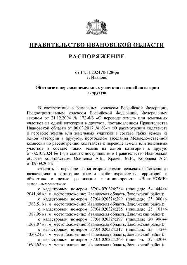 Распоряжение Правительства Ивановской области от 14.11.2024 N 128-рп "Об отказе в переводе земельных участков из одной категории в другую"