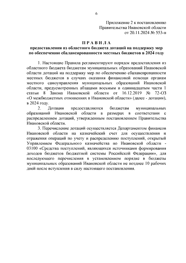 Постановление Правительства Ивановской области от 20.11.2024 N 553-п "О предоставлении из областного бюджета бюджетам муниципальных образований Ивановской области дотаций на поддержку мер по обеспечению сбалансированности местных бюджетов в 2024 году" (вместе с "Методикой распределения из областного бюджета дотаций на поддержку мер по обеспечению сбалансированности местных бюджетов в 2024 году", "Правилами предоставления из областного бюджета дотаций на поддержку мер по обеспечению сбалансированности местных бюджетов в 2024 году")