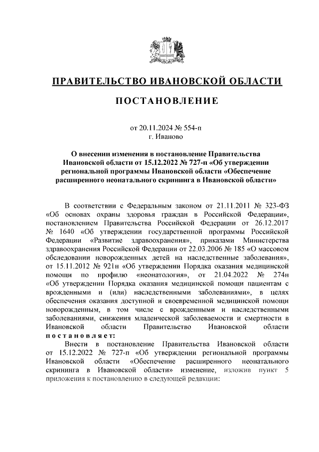 Постановление Правительства Ивановской области от 20.11.2024 N 554-п "О внесении изменения в постановление Правительства Ивановской области от 15.12.2022 N 727-п "Об утверждении региональной программы Ивановской области "Обеспечение расширенного неонатального скрининга в Ивановской области"