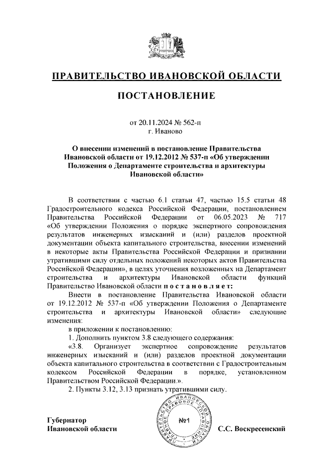 Постановление Правительства Ивановской области от 20.11.2024 N 562-п "О внесении изменений в постановление Правительства Ивановской области от 19.12.2012 N 537-п "Об утверждении Положения о Департаменте строительства и архитектуры Ивановской области"