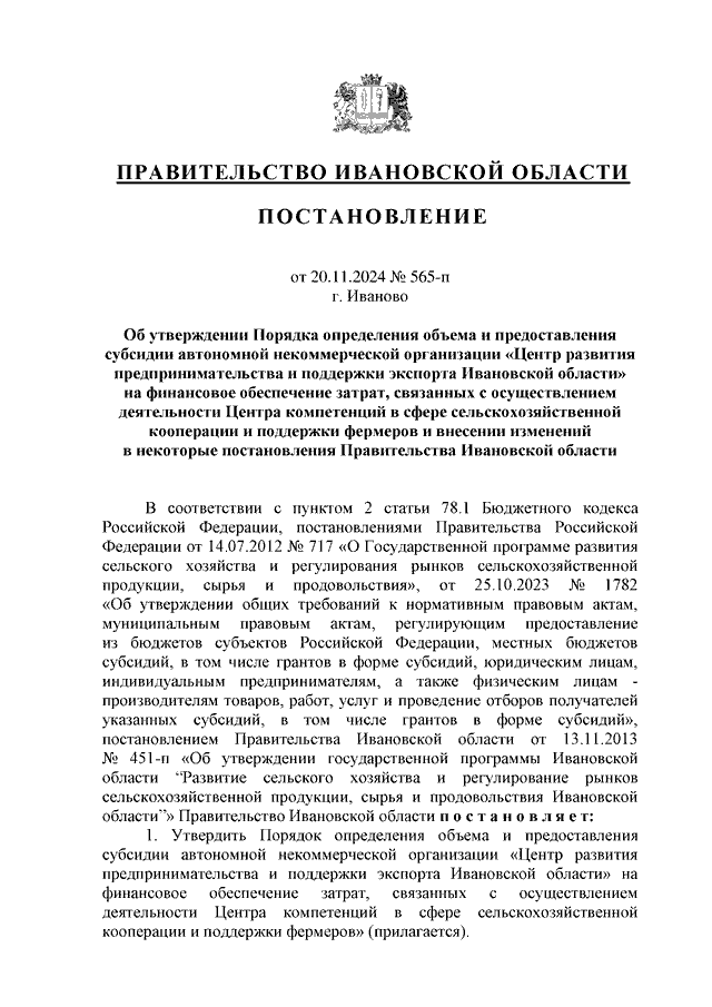 Постановление Правительства Ивановской области от 20.11.2024 N 565-п "Об утверждении Порядка определения объема и предоставления субсидии автономной некоммерческой организации "Центр развития предпринимательства и поддержки экспорта Ивановской области" на финансовое обеспечение затрат, связанных с осуществлением деятельности Центра компетенций в сфере сельскохозяйственной кооперации и поддержки фермеров, и внесении изменений в некоторые постановления Правительства Ивановской области"