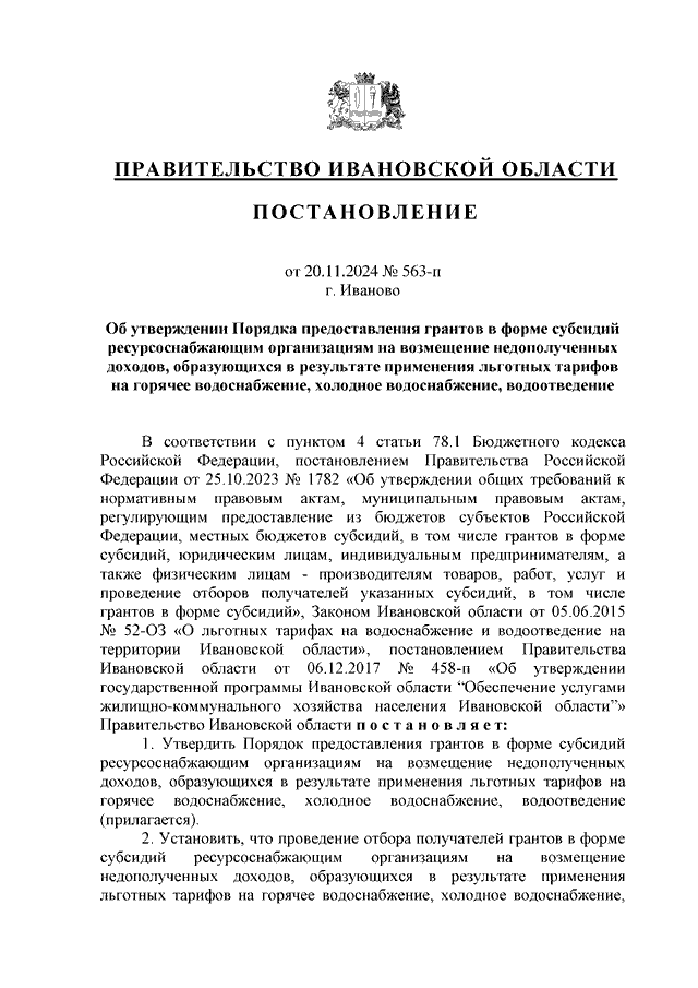 Постановление Правительства Ивановской области от 20.11.2024 N 563-п "Об утверждении Порядка предоставления грантов в форме субсидий ресурсоснабжающим организациям на возмещение недополученных доходов, образующихся в результате применения льготных тарифов на горячее водоснабжение, холодное водоснабжение, водоотведение"