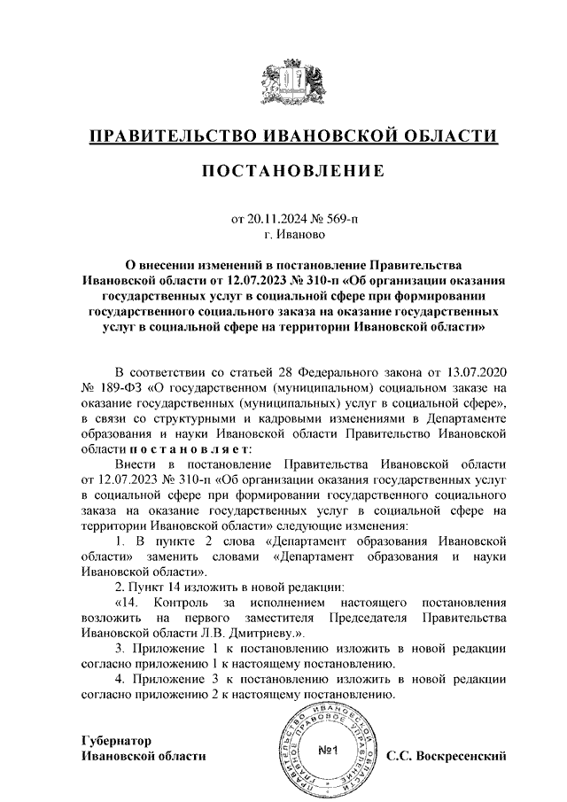 Постановление Правительства Ивановской области от 20.11.2024 N 569-п "О внесении изменений в постановление Правительства Ивановской области от 12.07.2023 N 310-п "Об организации оказания государственных услуг в социальной сфере при формировании государственного социального заказа на оказание государственных услуг в социальной сфере на территории Ивановской области"
