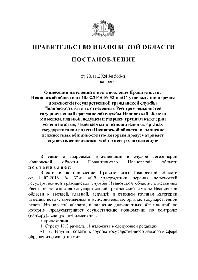Постановление Правительства Ивановской области от 20.11.2024 N 566-п "О внесении изменений в постановление Правительства Ивановской области от 10.02.2016 N 32-п "Об утверждении перечня должностей государственной гражданской службы Ивановской области, отнесенных Реестром должностей государственной гражданской службы Ивановской области к высшей, главной, ведущей и старшей группам категории "специалисты", замещаемых в исполнительных органах государственной власти Ивановской области, исполнение должностных обязанностей по которым предусматривает осуществление полномочий по контролю (надзору)"
