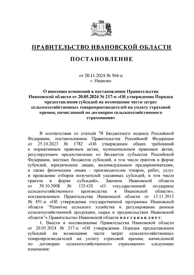 Постановление Правительства Ивановской области от 20.11.2024 N 564-п "О внесении изменений в постановление Правительства Ивановской области от 20.05.2024 N 217-п "Об утверждении Порядка предоставления субсидий на возмещение части затрат сельскохозяйственных товаропроизводителей на уплату страховой премии, начисленной по договорам сельскохозяйственного страхования"