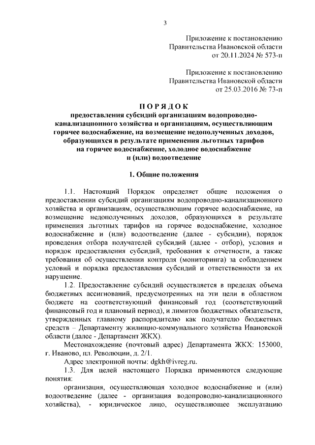 Постановление Правительства Ивановской области от 20.11.2024 N 573-п "О внесении изменений в постановление Правительства Ивановской области от 25.03.2016 N 73-п "О предоставлении субсидий организациям водопроводно-канализационного хозяйства и организациям, осуществляющим горячее водоснабжение, на возмещение недополученных доходов, образующихся в результате применения льготных тарифов на горячее водоснабжение, холодное водоснабжение и (или) водоотведение" (вместе с "Порядком предоставления субсидий организациям водопроводно-канализационного хозяйства и организациям, осуществляющим горячее водоснабжение, на возмещение недополученных доходов, образующихся в результате применения льготных тарифов на горячее водоснабжение, холодное водоснабжение и (или) водоотведение")