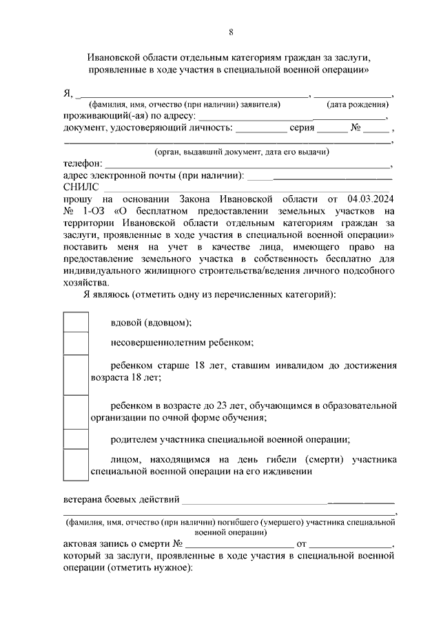 Постановление Правительства Ивановской области от 29.11.2024 N 576-п "О мерах по реализации Закона Ивановской области от 04.03.2024 N 1-ОЗ "О бесплатном предоставлении земельных участков на территории Ивановской области отдельным категориям граждан за заслуги, проявленные в ходе участия в специальной военной операции" и внесении изменений в некоторые постановления Правительства Ивановской области" (вместе с "Перечнем документов, необходимых для постановки военнослужащих, лиц, заключивших контракт о пребывании в добровольческом формировании, содействующем выполнению задач, возложенных на Вооруженные Силы Российской Федерации (войска национальной гвардии Российской Федерации), и лиц, проходящих (проходивших) службу в войсках национальной гвардии Российской Федерации и имеющих специальные звания полиции, удостоенных звания Героя Российской Федерации или награжденных орденами Российской Федерации за заслуги, проявленные в ходе участия в специальной военной операции, и являющихся ветеранами боевых действий и членов семей указанных военнослужащих и лиц, погибших (умерших) вследствие увечья (ранения, травмы, контузии) или заболевания, полученных ими в ходе участия в специальной военной операции, в качестве лиц, имеющих право на бесплатное предоставление в собственность земельных участков в соответствии с Законом Ивановской области от 04.03.2024 N 1-ОЗ "О бесплатном предоставлении земельных участков на территории Ивановской области отдельным категориям граждан за заслуги, проявленные в ходе участия в специальной военной операции", "Перечнем документов, необходимых для предоставления в собственность бесплатно земельного участка военнослужащим, лицам, заключившим контракт о пребывании в добровольческом формировании, содействующем выполнению задач, возложенных на Вооруженные Силы Российской Федерации (войска национальной гвардии Российской Федерации), и лицам, проходящим (проходившим) службу в войсках национальной гвардии Российской Федерации и имеющим специальные звания полиции, удостоенным звания Героя Российской Федерации или награжденным орденами Российской Федерации за заслуги, проявленные в ходе участия в специальной военной операции, и являющимся ветеранами боевых действий, и членам семей указанных военнослужащих и лиц, погибших (умерших) вследствие увечья (ранения, травмы, контузии) или заболевания, полученных ими в ходе участия в специальной военной операции, в соответствии с Законом Ивановской области от 04.03.2024 N 1-ОЗ "О бесплатном предоставлении земельных участков на территории Ивановской области отдельным категориям граждан за заслуги, проявленные в ходе участия в специальной военной операции", "Порядком взаимодействия органов местного самоуправления муниципальных образований Ивановской области с центральным исполнительным органом государственной власти Ивановской области, уполномоченным на осуществление учета военнослужащих, лиц, заключивших контракт о пребывании в добровольческом формировании, содействующем выполнению задач, возложенных на Вооруженные Силы Российской Федерации (войска национальной гвардии Российской Федерации), и лиц, проходящих (проходивших) службу в войсках национальной гвардии Российской Федерации и имеющих специальные звания полиции, удостоенных звания Героя Российской Фе