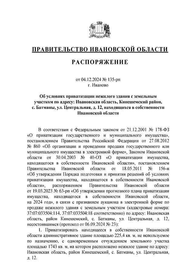 Распоряжение Правительства Ивановской области от 04.12.2024 N 135-рп "Об условиях приватизации нежилого здания с земельным участком по адресу: Ивановская область, Кинешемский район, с. Батманы, ул. Центральная, д. 12, находящихся в собственности Ивановской области"