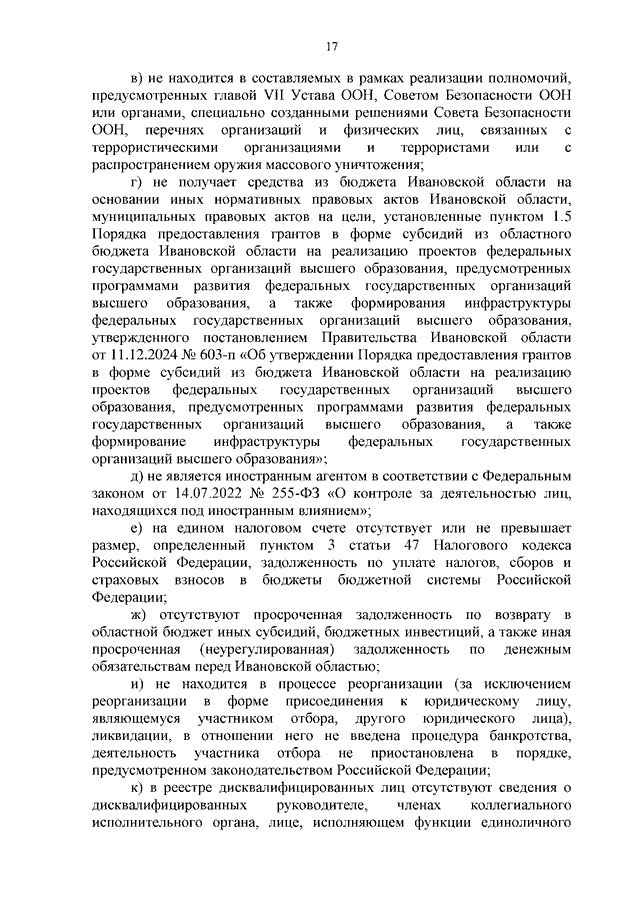 Постановление Правительства Ивановской области от 11.12.2024 N 603-п "Об утверждении Порядка предоставления грантов в форме субсидий из бюджета Ивановской области на реализацию проектов федеральных государственных организаций высшего образования, предусмотренных программами развития федеральных государственных организаций высшего образования, а также формирование инфраструктуры федеральных государственных организаций высшего образования"
