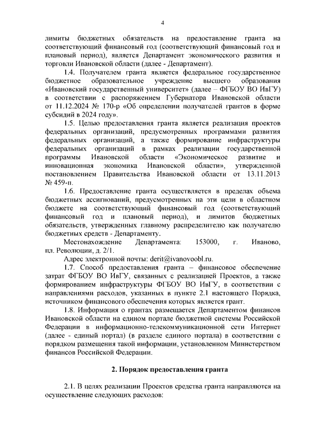Постановление Правительства Ивановской области от 11.12.2024 N 603-п "Об утверждении Порядка предоставления грантов в форме субсидий из бюджета Ивановской области на реализацию проектов федеральных государственных организаций высшего образования, предусмотренных программами развития федеральных государственных организаций высшего образования, а также формирование инфраструктуры федеральных государственных организаций высшего образования"
