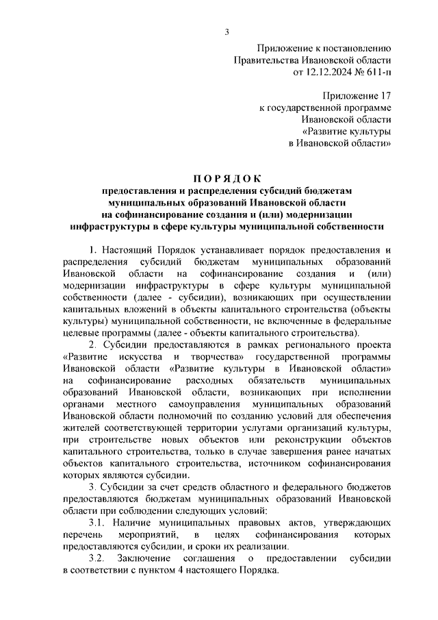 Постановление Правительства Ивановской области от 12.12.2024 N 611-п "О внесении изменений в постановления Правительства Ивановской области от 06.12.2017 N 455-п "Об утверждении государственной программы Ивановской области "Развитие культуры в Ивановской области" и от 25.03.2024 N 107-п "О реализации мероприятий, направленных на развитие культуры в Ивановской области" (вместе с "Порядком предоставления и распределения субсидий бюджетам муниципальных образований Ивановской области на софинансирование создания и (или) модернизации инфраструктуры в сфере культуры муниципальной собственности")