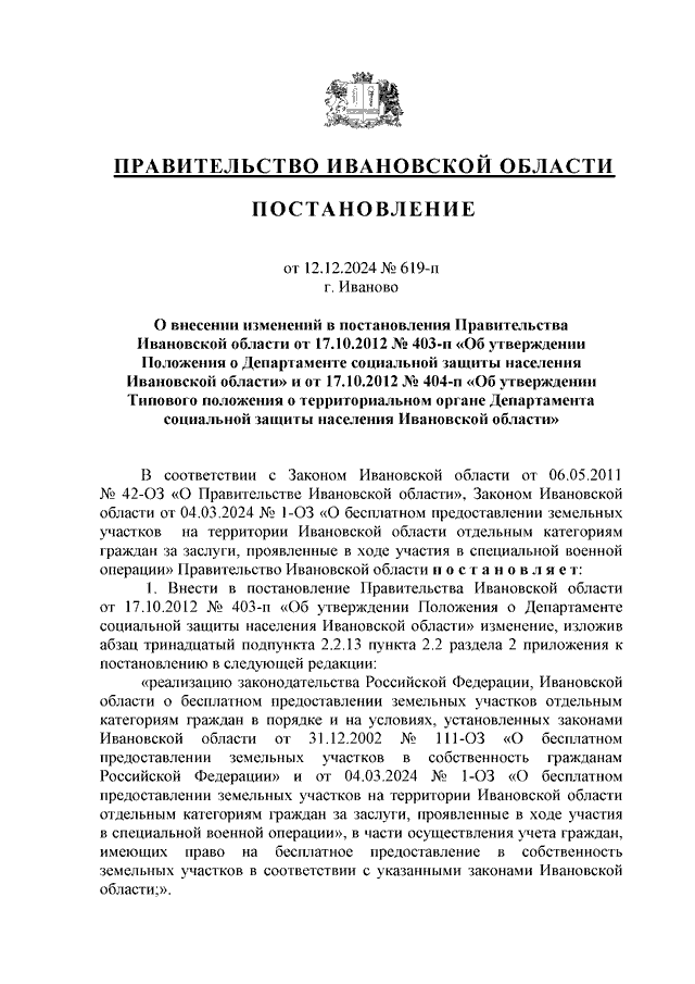 Постановление Правительства Ивановской области от 12.12.2024 N 619-п "О внесении изменений в постановления Правительства Ивановской области от 17.10.2012 N 403-п "Об утверждении Положения о Департаменте социальной защиты населения Ивановской области" и от 17.10.2012 N 404-п "Об утверждении Типового положения о территориальном органе Департамента социальной защиты населения Ивановской области"