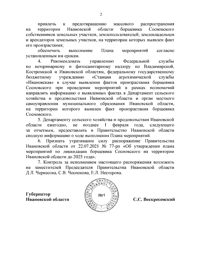 Распоряжение Правительства Ивановской области от 12.12.2024 N 138-рп "Об утверждении плана мероприятий по ликвидации борщевика Сосновского на территории Ивановской области на период до 2030 года"