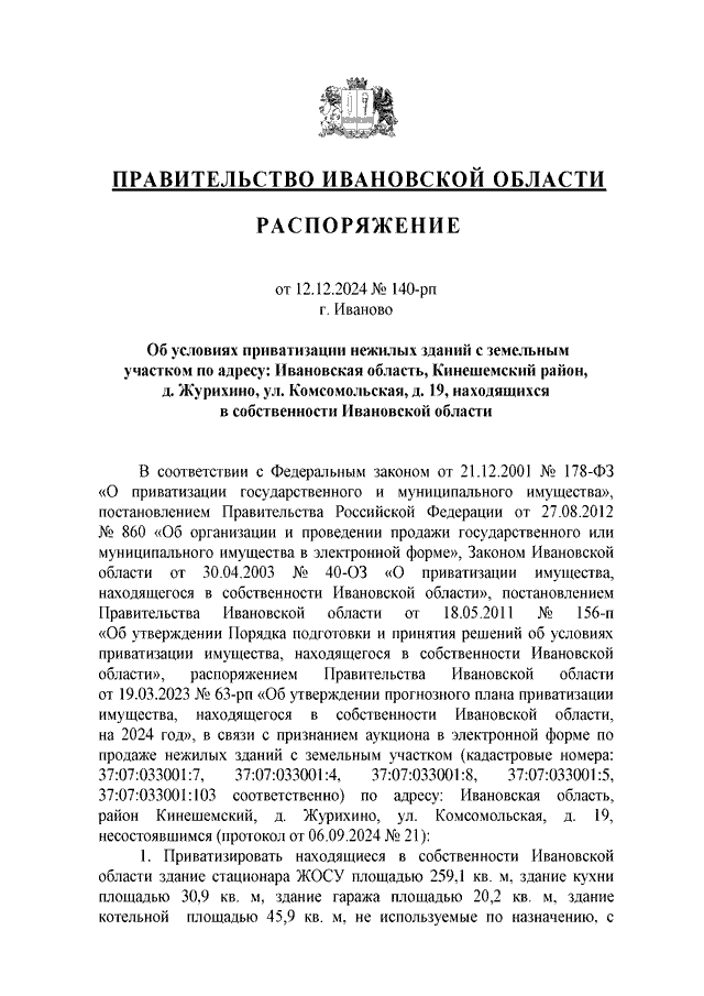 Распоряжение Правительства Ивановской области от 12.12.2024 N 140-рп "Об условиях приватизации нежилых зданий с земельным участком по адресу: Ивановская область, Кинешемский район, д. Журихино, ул. Комсомольская, д. 19, находящихся в собственности Ивановской области"
