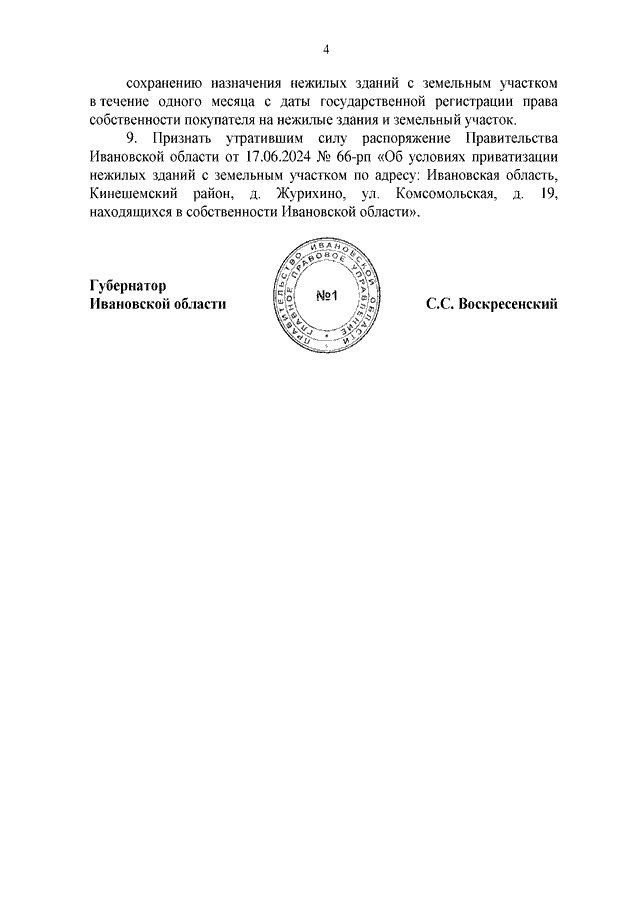 Распоряжение Правительства Ивановской области от 12.12.2024 N 140-рп "Об условиях приватизации нежилых зданий с земельным участком по адресу: Ивановская область, Кинешемский район, д. Журихино, ул. Комсомольская, д. 19, находящихся в собственности Ивановской области"