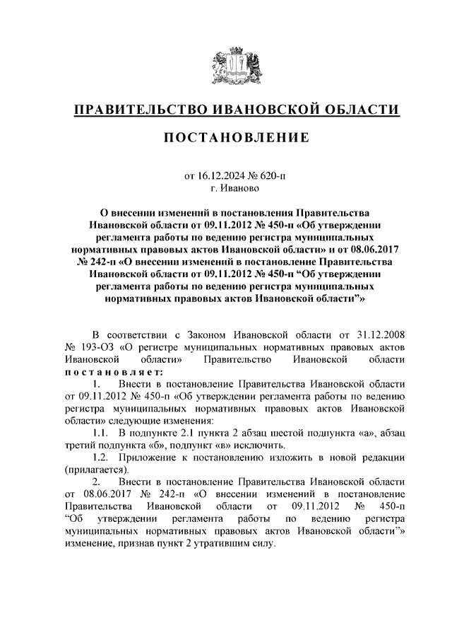 Постановление Правительства Ивановской области от 16.12.2024 N 620-п "О внесении изменений в постановления Правительства Ивановской области от 09.11.2012 N 450-п "Об утверждении регламента работы по ведению регистра муниципальных нормативных правовых актов Ивановской области" и от 08.06.2017 N 242-п "О внесении изменений в постановление Правительства Ивановской области от 09.11.2012 N 450-п "Об утверждении регламента работы по ведению регистра муниципальных нормативных правовых актов Ивановской области"