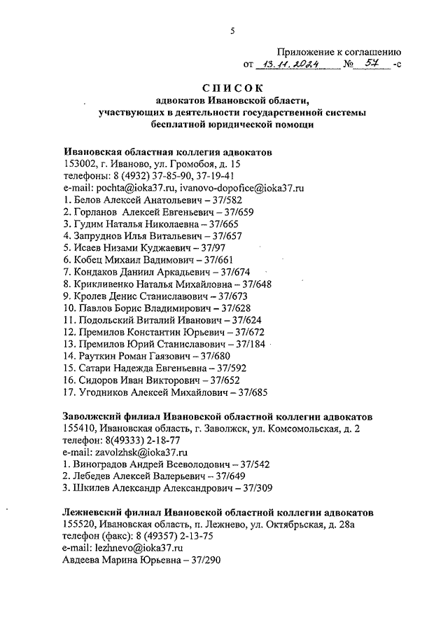 "Соглашение об оказании бесплатной юридической помощи адвокатами, являющимися участниками государственной системы бесплатной юридической помощи" (Заключено в г. Иваново 13.11.2024 N 57-с) (вместе со "Списком адвокатов Ивановской области, участвующих в деятельности государственной системы бесплатной юридической помощи")