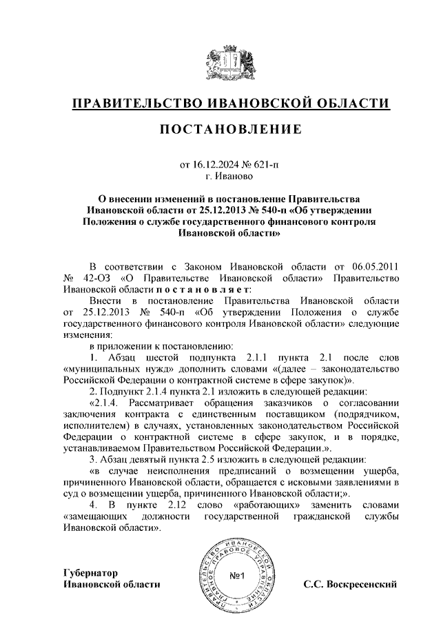 Постановление Правительства Ивановской области от 16.12.2024 N 621-п "О внесении изменений в постановление Правительства Ивановской области от 25.12.2013 N 540-п "Об утверждении Положения о службе государственного финансового контроля Ивановской области"