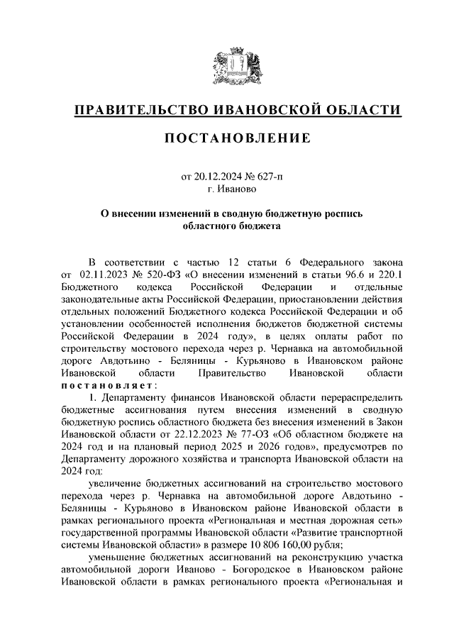Постановление Правительства Ивановской области от 20.12.2024 N 627-п "О внесении изменений в сводную бюджетную роспись областного бюджета"