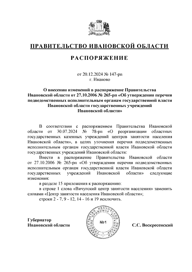 Распоряжение Правительства Ивановской области от 20.12.2024 N 147-рп "О внесении изменений в распоряжение Правительства Ивановской области от 27.10.2006 N 265-рп "Об утверждении перечня подведомственных исполнительным органам государственной власти Ивановской области государственных учреждений Ивановской области"