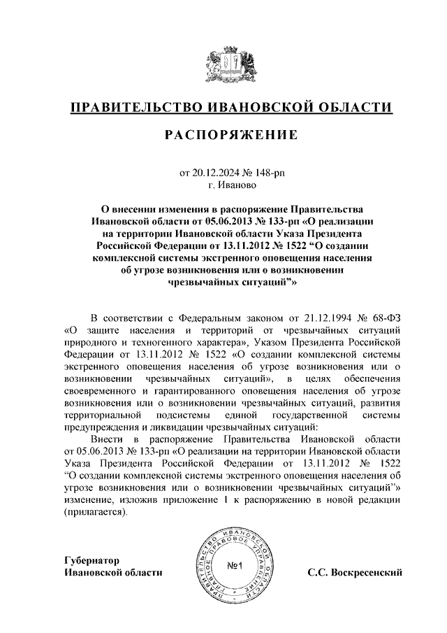 Распоряжение Правительства Ивановской области от 20.12.2024 N 148-рп "О внесении изменения в распоряжение Правительства Ивановской области от 05.06.2013 N 133-рп "О реализации на территории Ивановской области Указа Президента Российской Федерации от 13.11.2012 N 1522 "О создании комплексной системы экстренного оповещения населения об угрозе возникновения или о возникновении чрезвычайных ситуаций" (вместе с "Перечнем зон экстренного оповещения населения на территории Ивановской области")