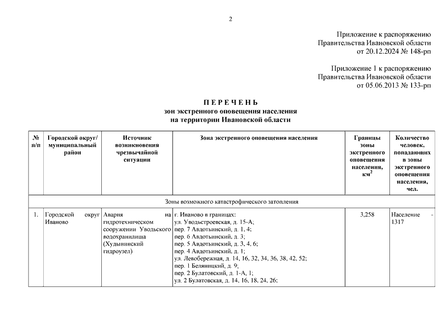 Распоряжение Правительства Ивановской области от 20.12.2024 N 148-рп "О внесении изменения в распоряжение Правительства Ивановской области от 05.06.2013 N 133-рп "О реализации на территории Ивановской области Указа Президента Российской Федерации от 13.11.2012 N 1522 "О создании комплексной системы экстренного оповещения населения об угрозе возникновения или о возникновении чрезвычайных ситуаций" (вместе с "Перечнем зон экстренного оповещения населения на территории Ивановской области")