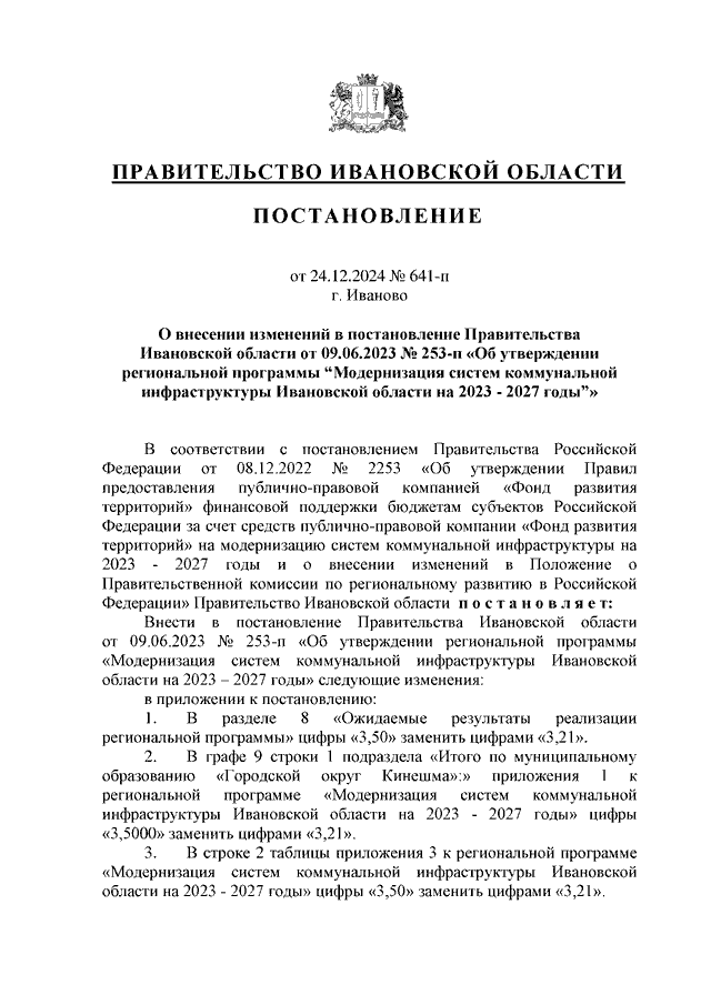 Постановление Правительства Ивановской области от 24.12.2024 N 641-п "О внесении изменений в постановление Правительства Ивановской области от 09.06.2023 N 253-п "Об утверждении региональной программы "Модернизация систем коммунальной инфраструктуры Ивановской области на 2023 - 2027 годы"
