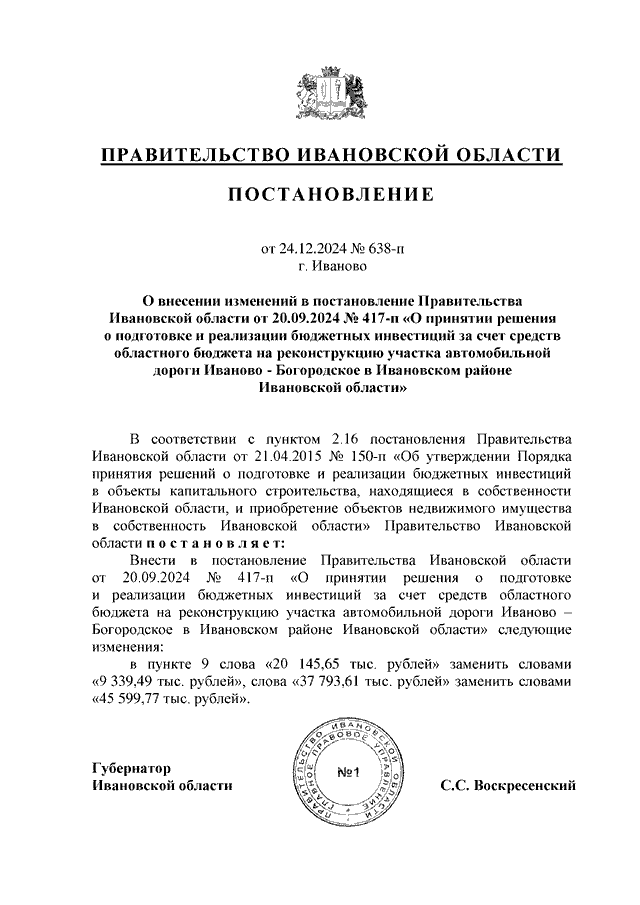 Постановление Правительства Ивановской области от 24.12.2024 N 638-п "О внесении изменений в постановление Правительства Ивановской области от 20.09.2024 N 417-п "О принятии решения о подготовке и реализации бюджетных инвестиций за счет средств областного бюджета на реконструкцию участка автомобильной дороги Иваново - Богородское в Ивановском районе Ивановской области"