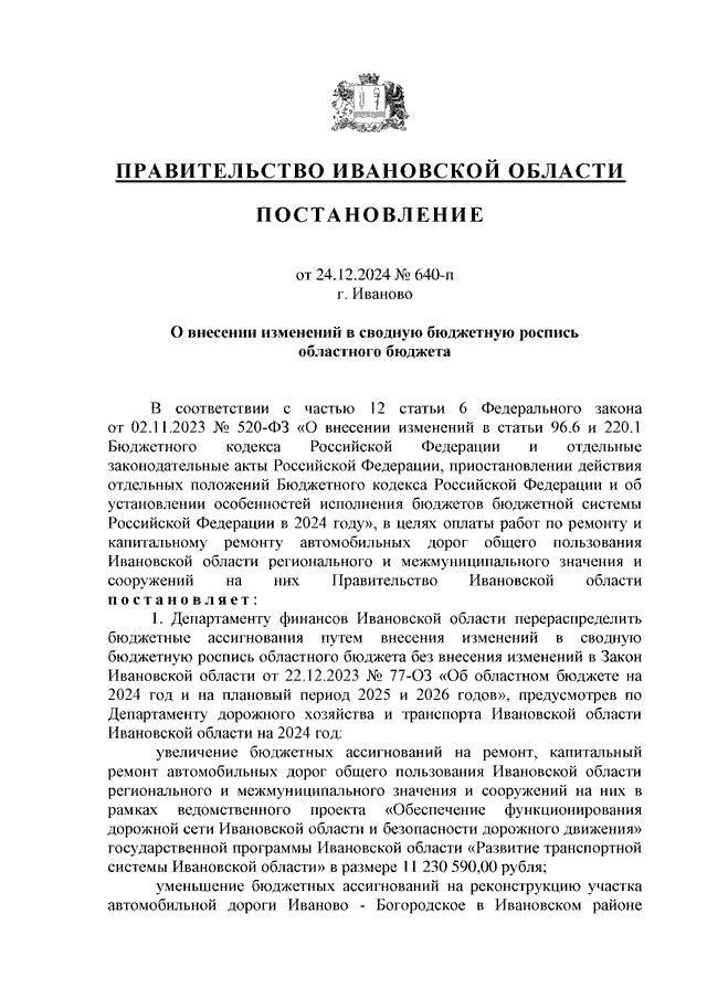 Постановление Правительства Ивановской области от 24.12.2024 N 640-п "О внесении изменений в сводную бюджетную роспись областного бюджета"