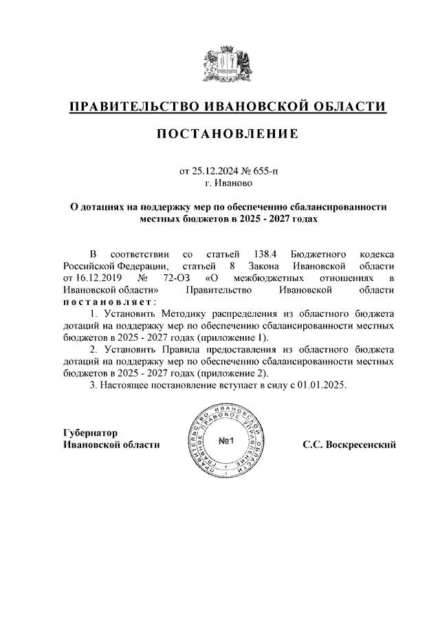 Постановление Правительства Ивановской области от 25.12.2024 N 655-п "О дотациях на поддержку мер по обеспечению сбалансированности местных бюджетов в 2025 - 2027 годах" (вместе с "Методикой распределения из областного бюджета дотаций на поддержку мер по обеспечению сбалансированности местных бюджетов в 2025 - 2027 годах", "Правилами предоставления из областного бюджета дотаций на поддержку мер по обеспечению сбалансированности местных бюджетов в 2025 - 2027 годах")