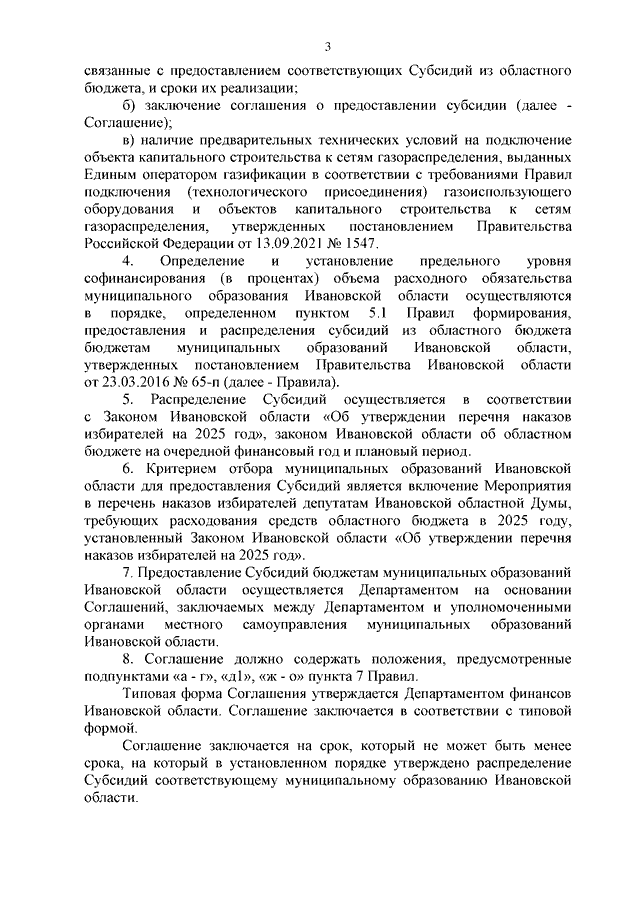 Постановление Правительства Ивановской области от 24.12.2024 N 644-п "Об утверждении Порядка предоставления и распределения субсидий из областного бюджета бюджетам муниципальных образований Ивановской области на подключение (технологическое присоединение) к сетям газораспределения объекта капитального строительства в рамках иных непрограммных мероприятий по наказам избирателей депутатам Ивановской областной Думы в 2025 году"