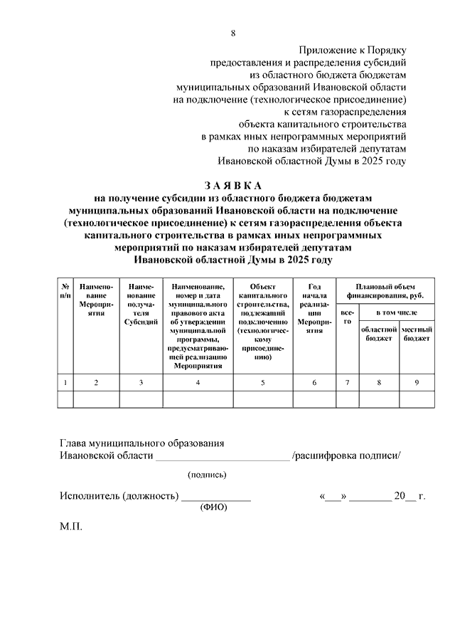 Постановление Правительства Ивановской области от 24.12.2024 N 644-п "Об утверждении Порядка предоставления и распределения субсидий из областного бюджета бюджетам муниципальных образований Ивановской области на подключение (технологическое присоединение) к сетям газораспределения объекта капитального строительства в рамках иных непрограммных мероприятий по наказам избирателей депутатам Ивановской областной Думы в 2025 году"