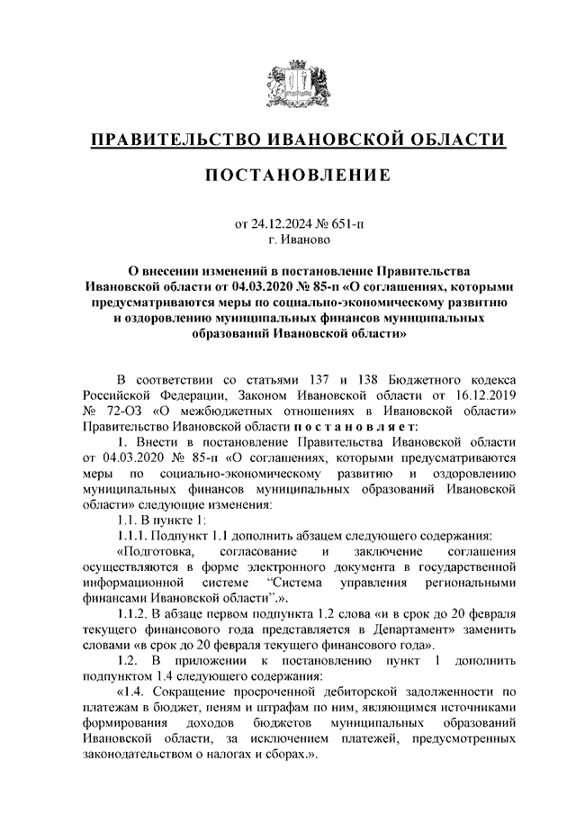 Постановление Правительства Ивановской области от 24.12.2024 N 651-п "О внесении изменений в постановление Правительства Ивановской области от 04.03.2020 N 85-п "О соглашениях, которыми предусматриваются меры по социально-экономическому развитию и оздоровлению муниципальных финансов муниципальных образований Ивановской области"