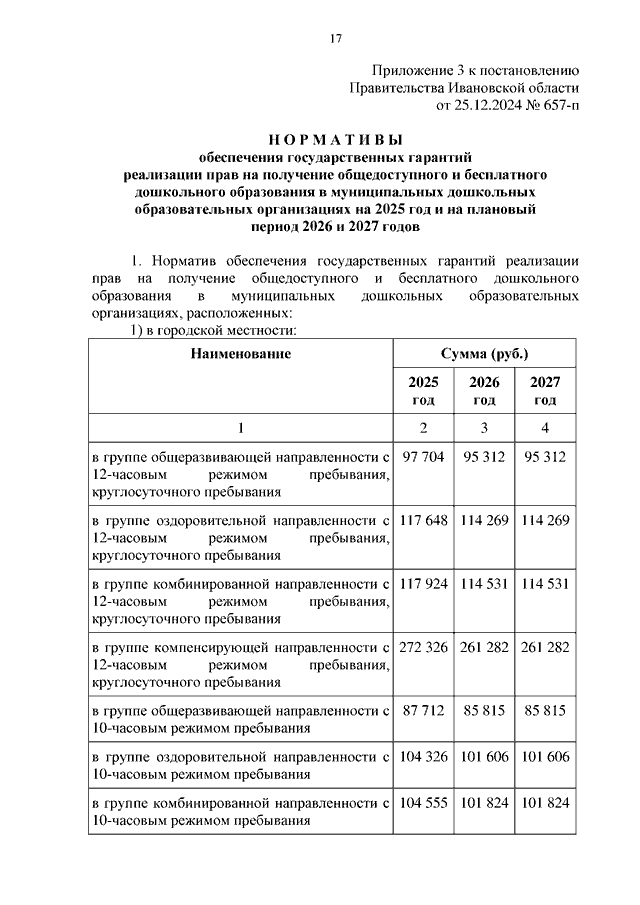 Постановление Правительства Ивановской области от 25.12.2024 N 657-п "Об утверждении нормативов обеспечения государственных гарантий реализации прав на получение общедоступного и бесплатного общего образования, обеспечения дополнительного образования в муниципальных образовательных организациях и возмещения затрат на финансовое обеспечение получения общего образования в частных образовательных организациях на 2025 год и на плановый период 2026 и 2027 годов" (вместе с "Нормативами обеспечения государственных гарантий реализации прав на получение общедоступного и бесплатного дошкольного, начального общего, основного общего, среднего общего образования в муниципальных общеобразовательных организациях, обеспечения дополнительного образования в муниципальных общеобразовательных организациях на 2025 год и на плановый период 2026 и 2027 годов", "Нормативами возмещения затрат на финансовое обеспечение получения дошкольного, начального общего, основного общего, среднего общего образования в частных общеобразовательных организациях, осуществляющих образовательную деятельность по имеющим государственную аккредитацию основным общеобразовательным программам, на 2025 год и на плановый период 2026 и 2027 годов", "Нормативами обеспечения государственных гарантий реализации прав на получение общедоступного и бесплатного дошкольного образования в муниципальных дошкольных образовательных организациях на 2025 год и на плановый период 2026 и 2027 годов", "Нормативами возмещения затрат на финансовое обеспечение получения дошкольного образования в частных дошкольных образовательных организациях на 2025 год и на плановый период 2026 и 2027 годов", "Перечнем малокомплектных муниципальных общеобразовательных организаций, для которых применяется норматив финансового обеспечения, учитывающий затраты, не зависящие от количества обучающихся, для расчета субвенций местным бюджетам в размере, необходимом для реализации основных общеобразовательных программ в части финансирования расходов на оплату труда работников общеобразовательных организаций, расходов на учебники, учебные пособия, средства обучения, игры, игрушки (за исключением расходов на содержание зданий и оплату коммунальных услуг, осуществляемых из местных бюджетов)")