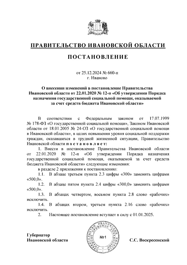 Постановление Правительства Ивановской области от 25.12.2024 N 660-п "О внесении изменений в постановление Правительства Ивановской области от 22.01.2020 N 12-п "Об утверждении Порядка назначения государственной социальной помощи, оказываемой за счет средств бюджета Ивановской области"