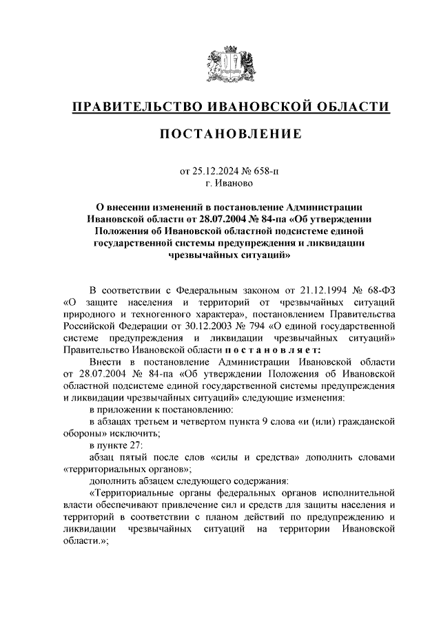 Постановление Правительства Ивановской области от 25.12.2024 N 658-п "О внесении изменений в постановление Администрации Ивановской области от 28.07.2004 N 84-па "Об утверждении Положения об Ивановской областной подсистеме единой государственной системы предупреждения и ликвидации чрезвычайных ситуаций"