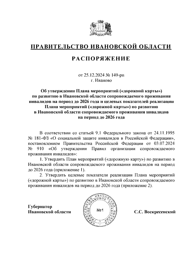 Распоряжение Правительства Ивановской области от 25.12.2024 N 149-рп "Об утверждении Плана мероприятий ("дорожной карты") по развитию в Ивановской области сопровождаемого проживания инвалидов на период до 2026 года и целевых показателей реализации Плана мероприятий ("дорожной карты") по развитию в Ивановской области сопровождаемого проживания инвалидов на период до 2026 года"