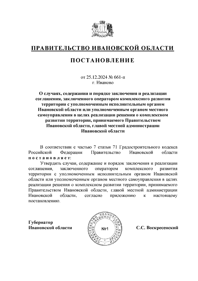 Постановление Правительства Ивановской области от 25.12.2024 N 661-п "О случаях, содержании и порядке заключения и реализации соглашения, заключенного оператором комплексного развития территории с уполномоченным исполнительным органом Ивановской области или уполномоченным органом местного самоуправления в целях реализации решения о комплексном развитии территории, принимаемого Правительством Ивановской области, главой местной администрации Ивановской области"