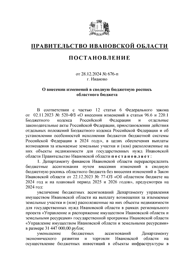 Постановление Правительства Ивановской области от 28.12.2024 N 676-п "О внесении изменений в сводную бюджетную роспись областного бюджета"