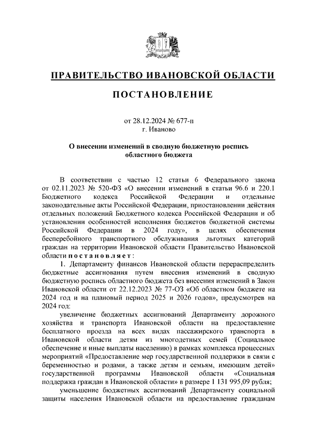 Постановление Правительства Ивановской области от 28.12.2024 N 677-п "О внесении изменений в сводную бюджетную роспись областного бюджета"