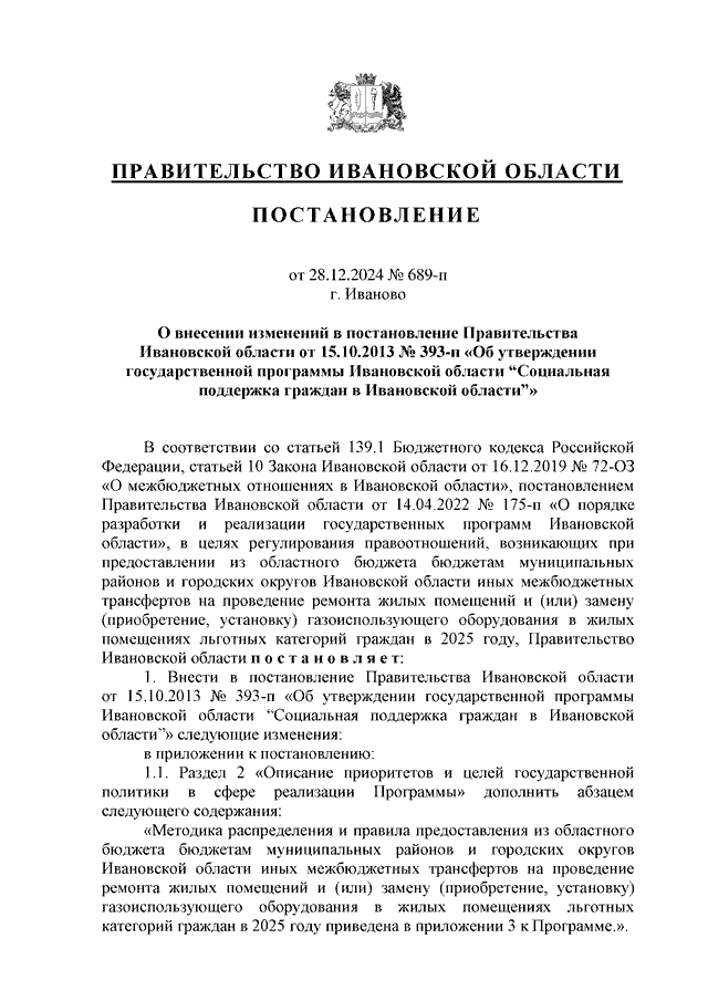 Постановление Правительства Ивановской области от 28.12.2024 N 689-п "О внесении изменений в постановление Правительства Ивановской области от 15.10.2013 N 393-п "Об утверждении государственной программы Ивановской области "Социальная поддержка граждан в Ивановской области" (вместе с "Методикой распределения и правилами предоставления из областного бюджета бюджетам муниципальных районов и городских округов Ивановской области иных межбюджетных трансфертов на проведение ремонта жилых помещений и (или) замену (приобретение, установку) газоиспользующего оборудования в жилых помещениях льготных категорий граждан в 2025 году")