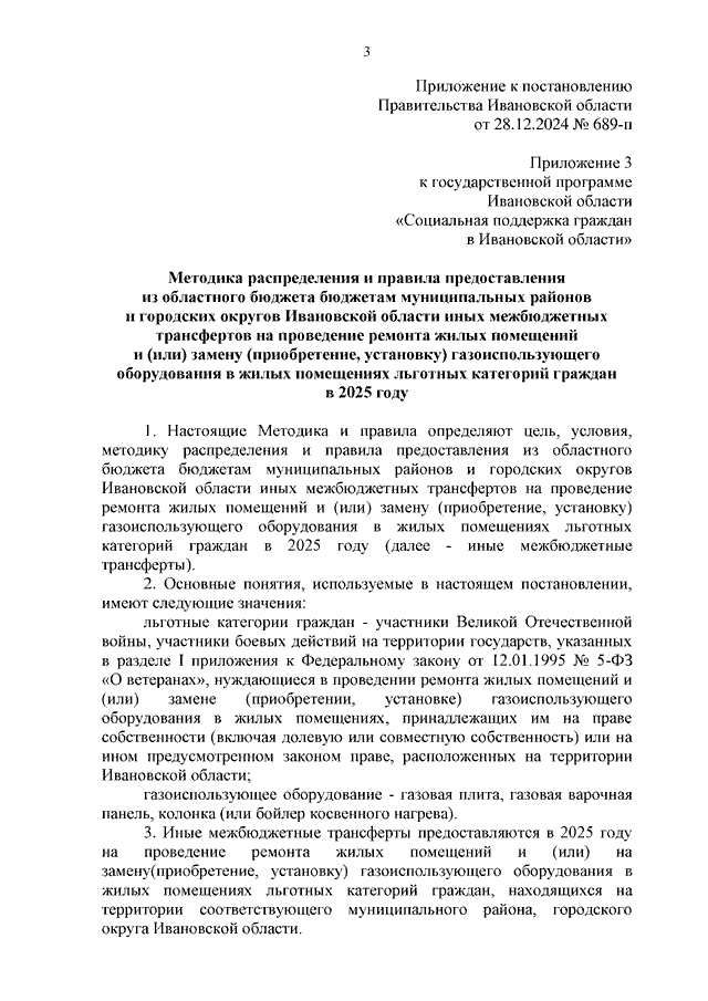 Постановление Правительства Ивановской области от 28.12.2024 N 689-п "О внесении изменений в постановление Правительства Ивановской области от 15.10.2013 N 393-п "Об утверждении государственной программы Ивановской области "Социальная поддержка граждан в Ивановской области" (вместе с "Методикой распределения и правилами предоставления из областного бюджета бюджетам муниципальных районов и городских округов Ивановской области иных межбюджетных трансфертов на проведение ремонта жилых помещений и (или) замену (приобретение, установку) газоиспользующего оборудования в жилых помещениях льготных категорий граждан в 2025 году")