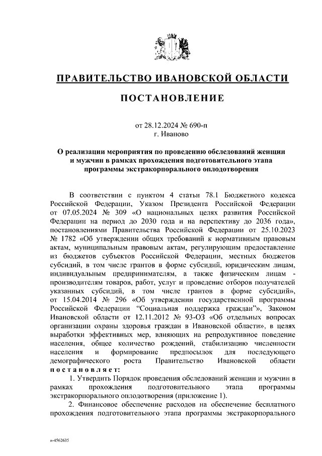 Постановление Правительства Ивановской области от 28.12.2024 N 690-п "О реализации мероприятия по проведению обследований женщин и мужчин в рамках прохождения подготовительного этапа программы экстракорпорального оплодотворения" (вместе с "Порядком проведения обследований женщин и мужчин в рамках прохождения подготовительного этапа программы экстракорпорального оплодотворения", "Порядком предоставления из областного бюджета гранта в форме субсидии на обеспечение бесплатного прохождения подготовительного этапа программы экстракорпорального оплодотворения, включающего необходимые генетические и гормональные исследования, дополнительные обследования, не предусмотренные системой обязательного медицинского страхования")