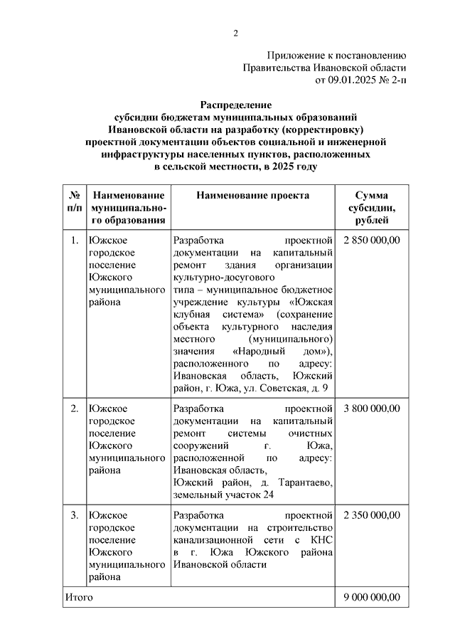 Постановление Правительства Ивановской области от 09.01.2025 N 2-п "О распределении субсидии бюджетам муниципальных образований Ивановской области на разработку (корректировку) проектной документации объектов социальной и инженерной инфраструктуры населенных пунктов, расположенных в сельской местности, в 2025 году"