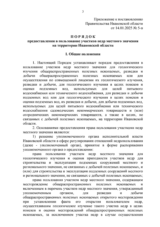 Постановление Правительства Ивановской области от 14.01.2025 N 5-п "Об утверждении Порядка предоставления в пользование участков недр местного значения на территории Ивановской области"