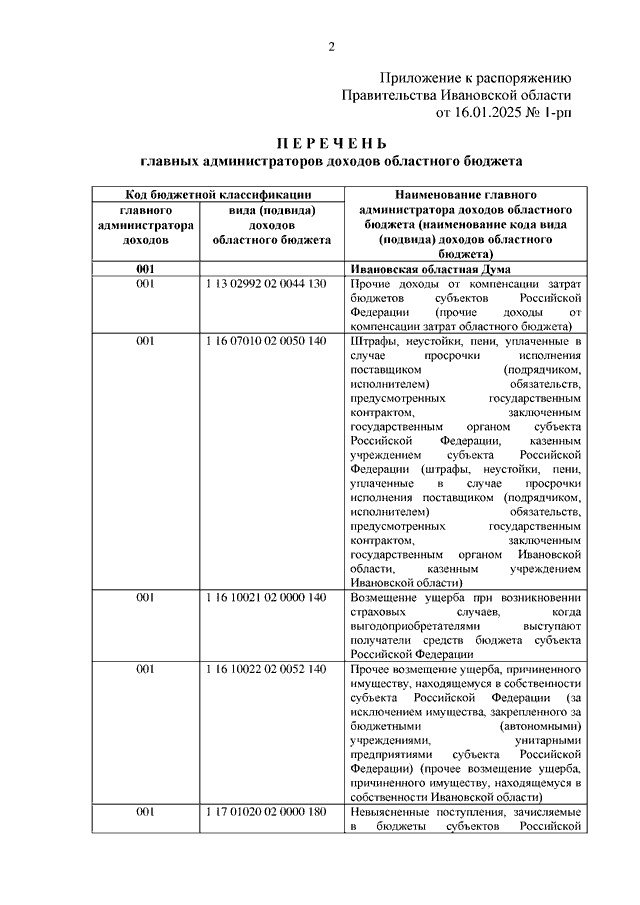 Распоряжение Правительства Ивановской области от 16.01.2025 N 1-рп "Об утверждении перечня главных администраторов доходов областного бюджета"
