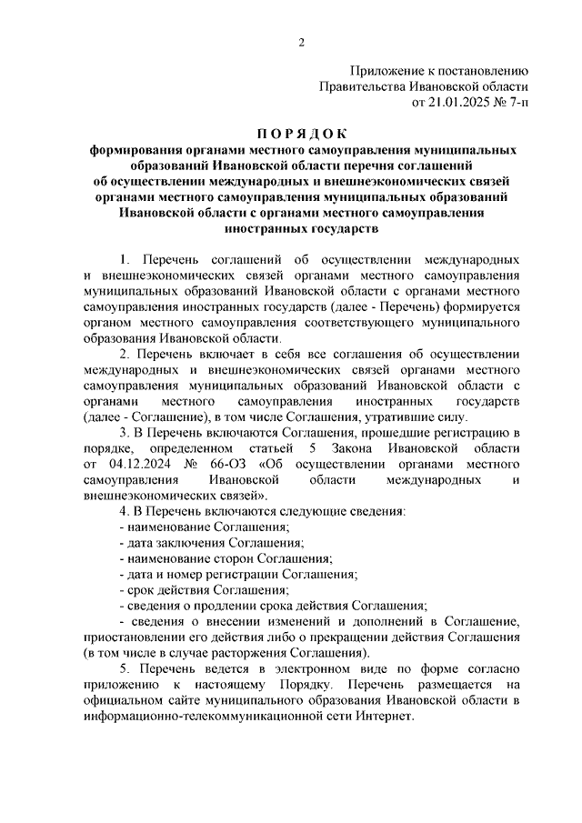Постановление Правительства Ивановской области от 21.01.2025 N 7-п "Об утверждении Порядка формирования органами местного самоуправления муниципальных образований Ивановской области перечня соглашений об осуществлении международных и внешнеэкономических связей органами местного самоуправления муниципальных образований Ивановской области с органами местного самоуправления иностранных государств"