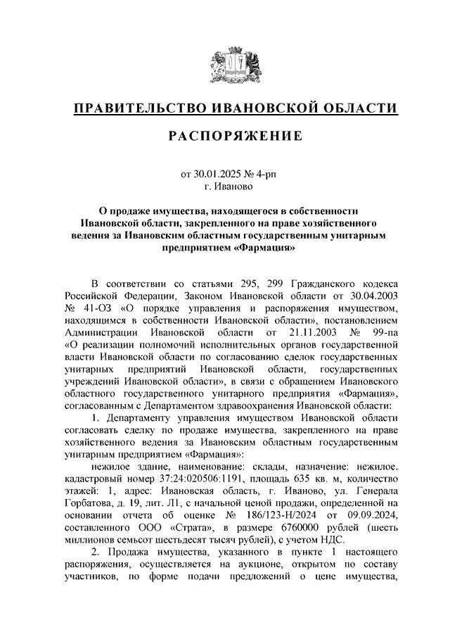 Распоряжение Правительства Ивановской области от 30.01.2025 N 4-рп "О продаже имущества, находящегося в собственности Ивановской области, закрепленного на праве хозяйственного ведения за Ивановским областным государственным унитарным предприятием "Фармация"