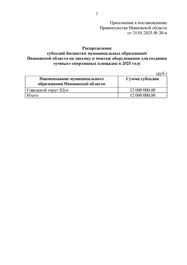 Постановление Правительства Ивановской области от 31.01.2025 N 20-п "О распределении субсидий бюджетам муниципальных образований Ивановской области на закупку и монтаж оборудования для создания "умных" спортивных площадок в 2025 году"