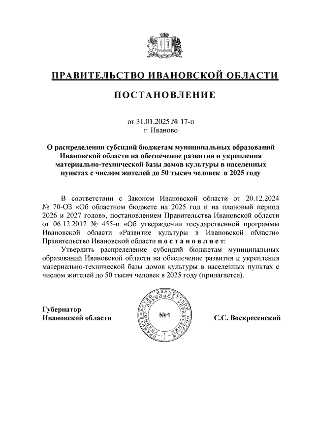 Постановление Правительства Ивановской области от 31.01.2025 N 17-п "О распределении субсидий бюджетам муниципальных образований Ивановской области на обеспечение развития и укрепления материально-технической базы домов культуры в населенных пунктах с числом жителей до 50 тысяч человек в 2025 году"